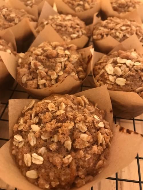 Banana bread muffins utilizing one of winters tastiest crops; wholegrain spelt. Spiced with fresh ginger, carrot and orange and sweetened with honey and topped with an oat + cinnamon streusel topping.